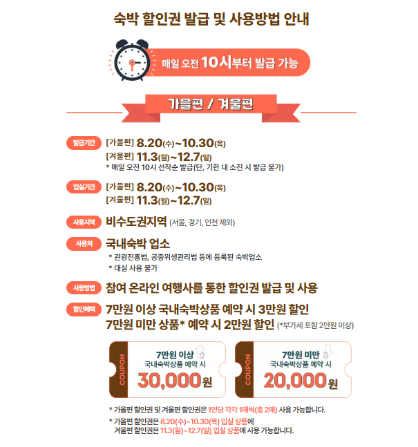 매일 오전 10시, 대한민국 숙박페스타 또는 제휴 온라인 여행사(OTA)에서 쿠폰 발급 가능.