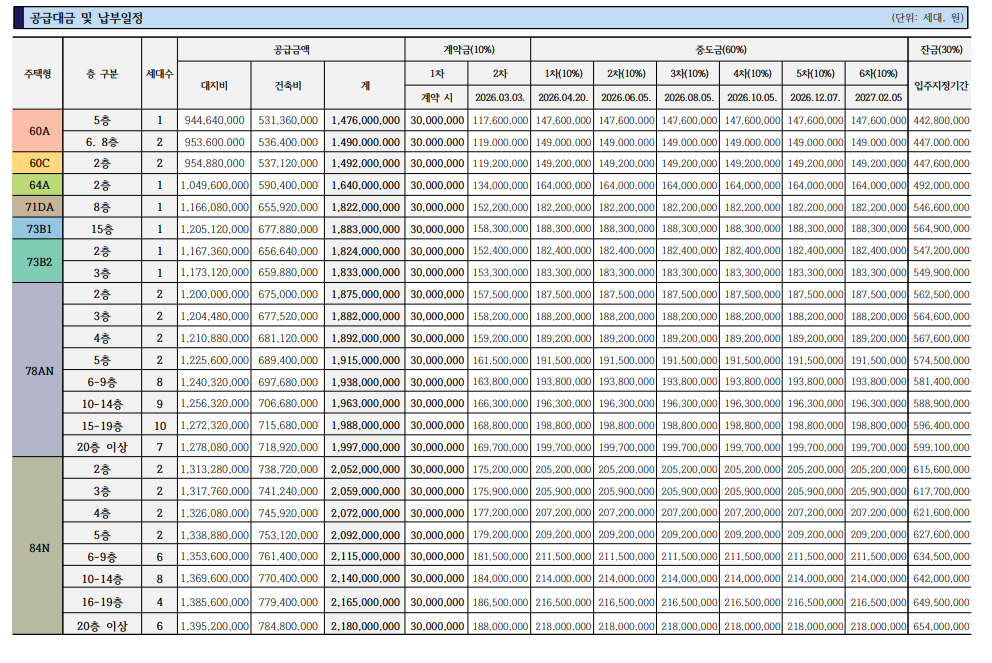 공급가를 기준으로 납부 방식을 보면 일반적으로는 계약금 약 10%, 이후 중도금 약 60%를 몇 차례로 분할 납부, 그리고 잔금 약 30%를 입주 전후에 납부하는 형태로 진행됩니다. 이 구조는 민영 아파트 분양에서 흔히 볼 수 있는 방식이며, 중도금은 대출·이자후불제 조건을 활용할 수 있는 경우가 많아 청약 준비 시 자금계획을 세울 때 미리 체크해야 할 부분입니다.