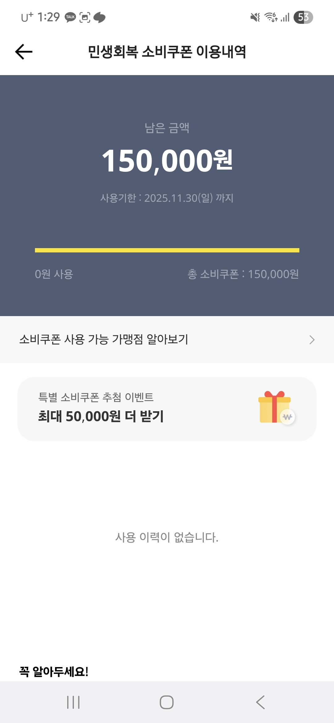 저는 이렇게 15만원 수령해서 15만원만큼 아직 금액이 남아있네요~